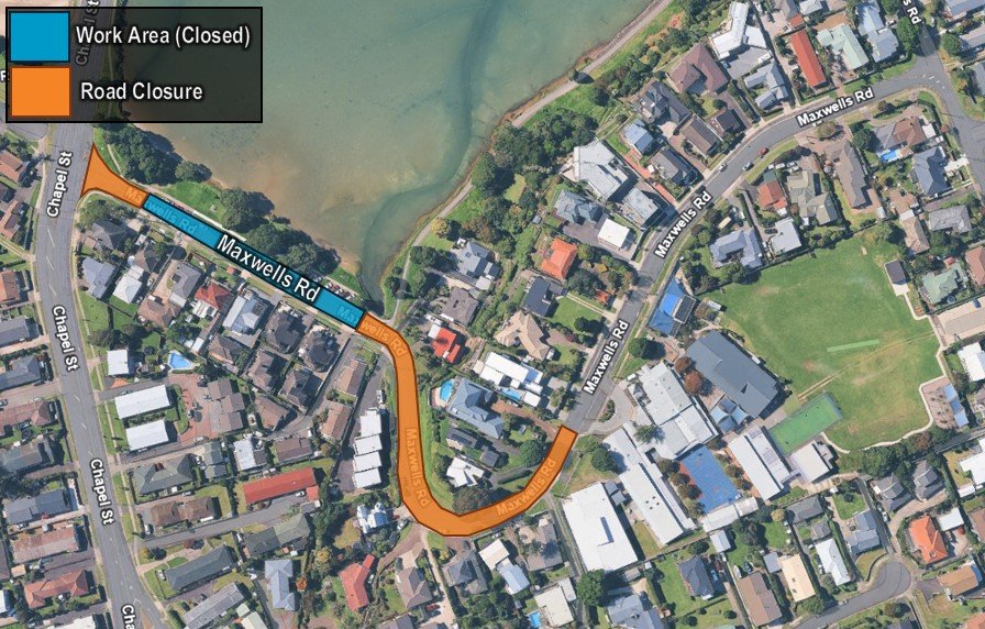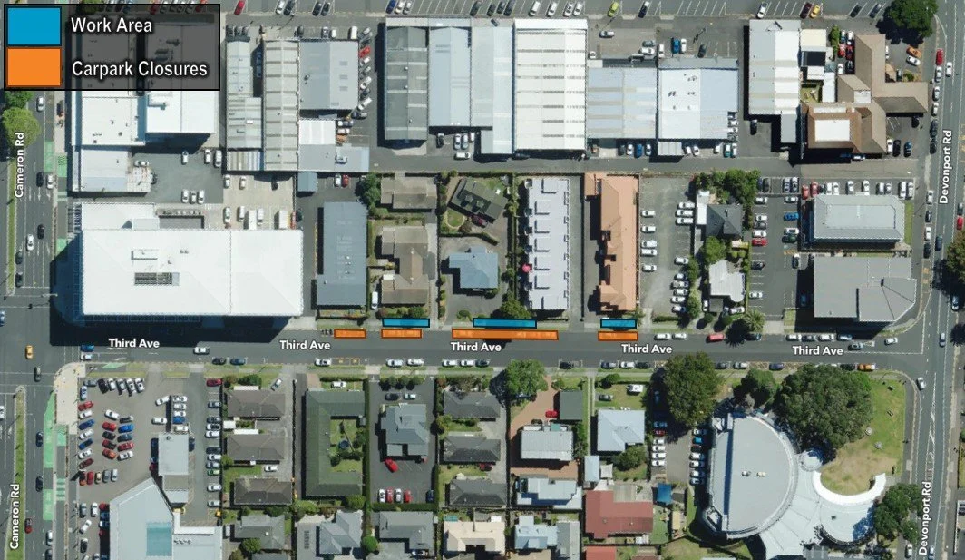 The affected area is highlighted and will be operating under a footpath closure and shoulder closures. The carparks will also be closed. Residents and businesses will still be able to access their properties.