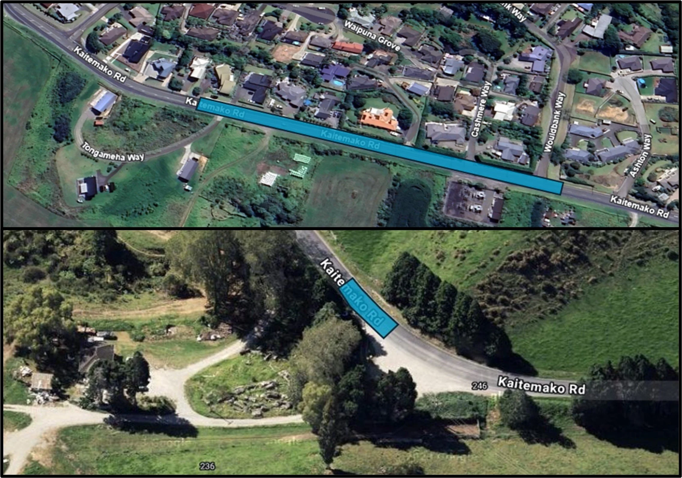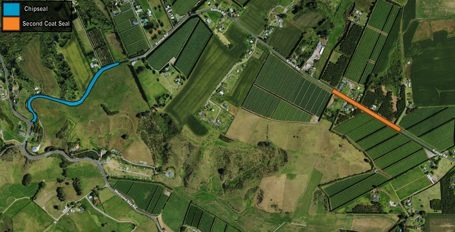 The area highlighted blue is a chipseal and the area highlighted orange is a second coat chipseal over the road repair we did earlier.
